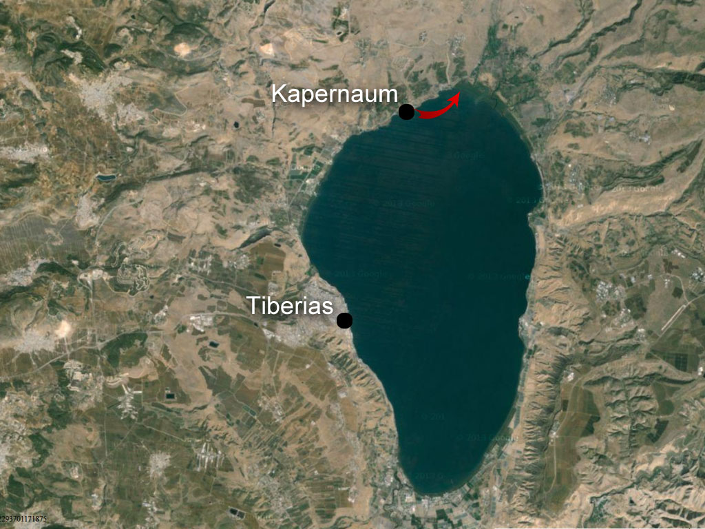 [Det är bara Johannes som använder namnet Tiberiassjön. De övriga evangelierna kallar den Galileiska sjön eller Gennesarets sjö. Sedan Herodes Antipas byggt staden Tiberias på den sydvästra sidan av sjön 22 e.Kr. blev det allt vanligare att sjön kallades Tiberiassjön. Eftersom Johannes skrev sitt evangelium mot århundradets slut, var det naturligt att också ta med det då aktuella namnet för att underlätta förståelsen för sin samtid. I dag kallas sjön för Kinneretsjön, vilket också är det namn som används i GT, se [4 Mos 34:11]. Det hebreiska ordet kinnor betyder harpa, eftersom sjöns form liknar en harpa.]