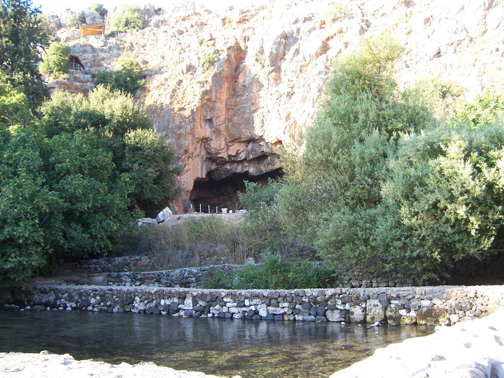 [Ett hedniskt område norr om Galileen. Här finns ett av källflödena för Jordanfloden, med utsikt över en brant klippvägg med grottor där bl.a. avguden Pan tillbads. Den största grottan kallades i folkmun helvetets port och ansågs vara en portal till dödsriket.]