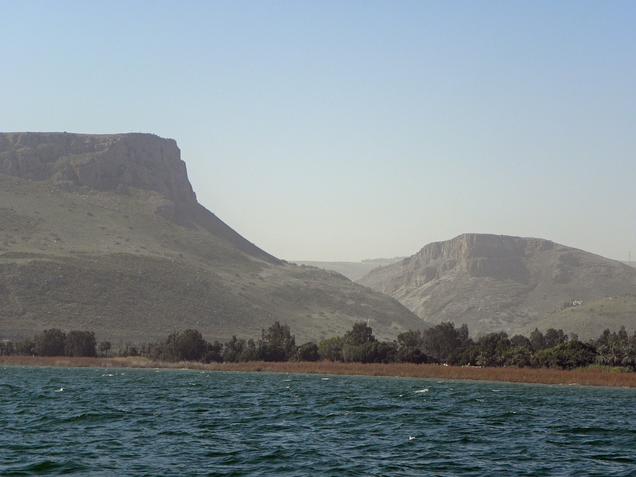 Berget Arbel reser sig bakom Magdala på den västra sidan av Galileiska sjön.