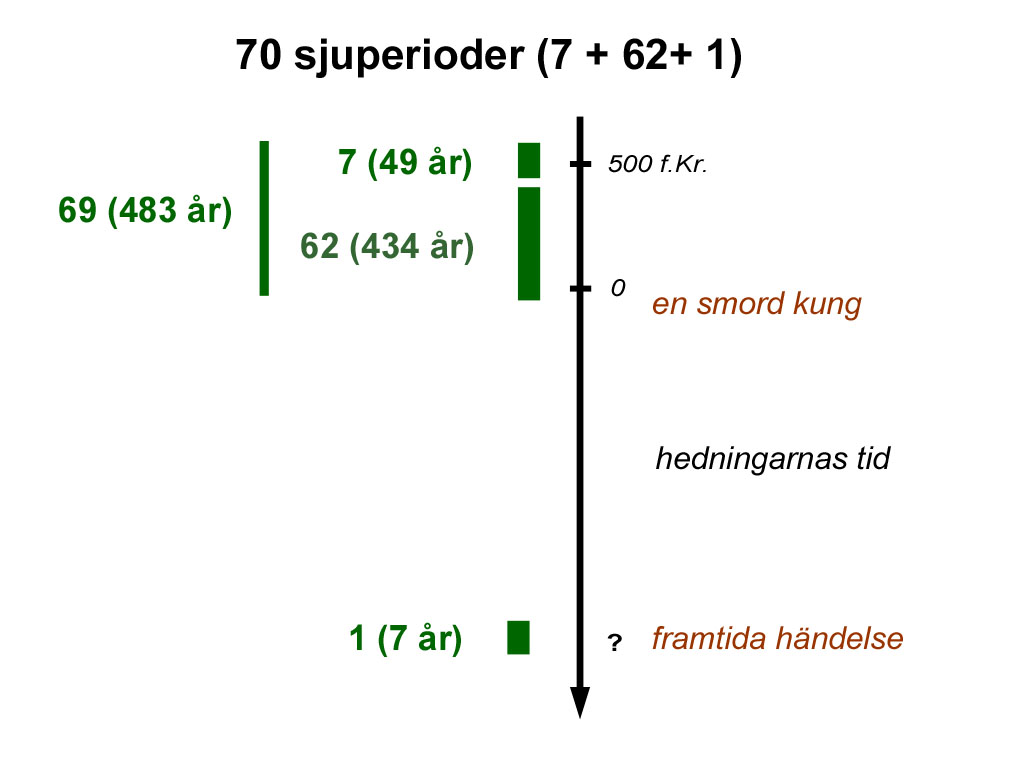 Den profetiska klockan tycks ha stannat efter 69 sjuperioder. En sjuperiod återstår. Jesus kom som en lidande tjänare, men kommer även att komma som en kung för att regera. Paulus talar om Israels förhärdelse tills hedningarna i fullt antal har kommit in, se [Rom 11:25].]