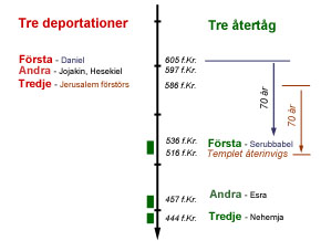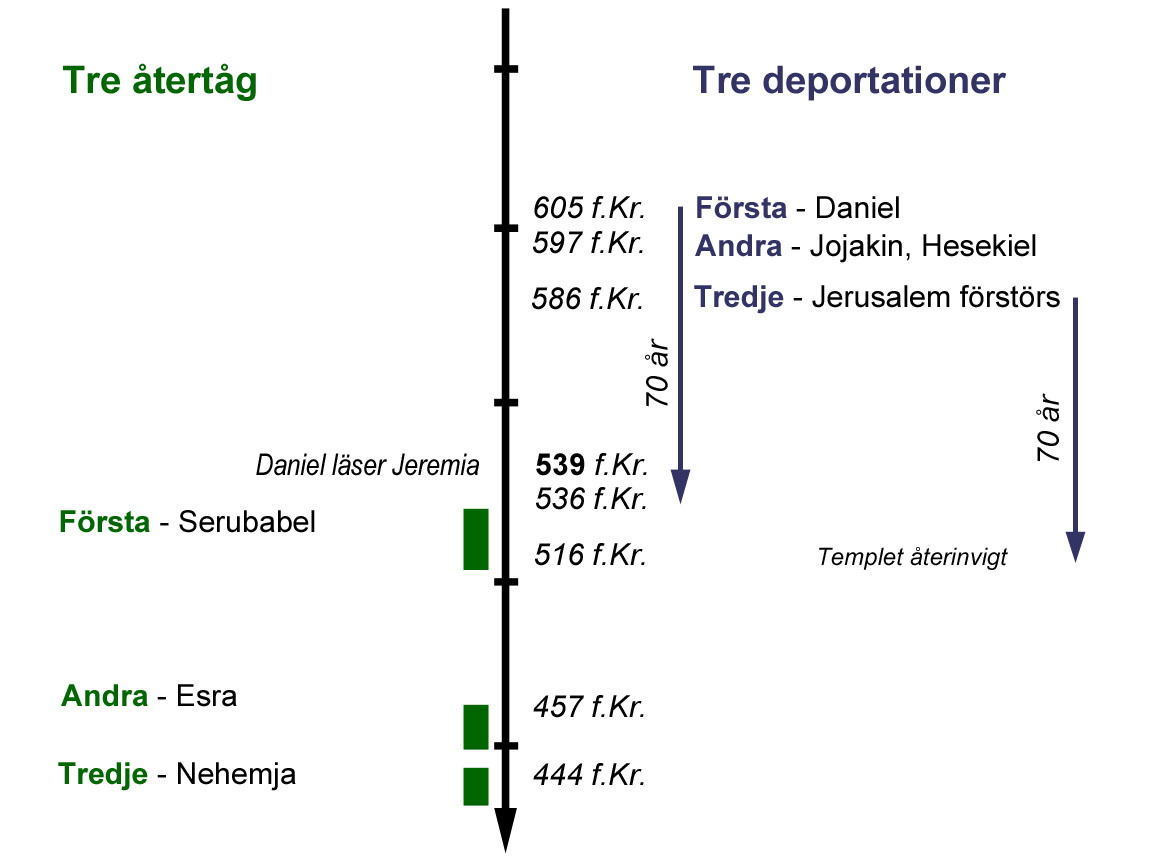Det sker tre stora vågor av deportationer och återvändanden. Kort efter att Daniel läst Jeremias profetior kommer Kyros proklamation 538 f.Kr. Den leder till att den första gruppen återvänder under Serubbabels ledning. När de kommer fram har det då gått 70 år sedan den första gruppen fördes bort i fångenskap. Det kommer även att visa sig att det är 70 år mellan Jerusalems förstörelse 586 f.Kr. och templets återinvigning 516 f.Kr.