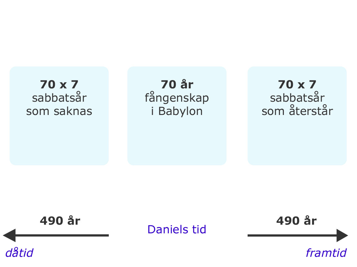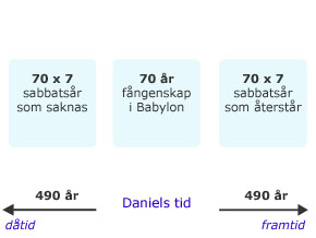 Systemet med sabbatsår började gälla när israeliterna kom in i landet, se [3 Mos 25:2]. När Salomo började bygga templet var det 480 år efter uttåget ur Egypten, se [1 Kung 6:1]. Samma varning om att folket skulle bli kringspridda ger Gud till Salomo, se [1 Kung 9:6-9]. Det nämns att Salomo tog ut höga skatter av folket och troligtvis hölls inte dessa sabbatsår, se [1 Kung 5:13-14; 12:6-11]. Detta resulterar i Jerusalems belägring 605 f.Kr. och Jerusalems fall 586 f.Kr. Det är värt att notera att det norra riket faller redan 722 f.Kr. Deras avfall var större än det södra rikets. De höll inte ens sabbaten en gång i veckan eller de andra högtidsdagarna, vilket kan vara anledningen till att deras tid rann ut snabbare.